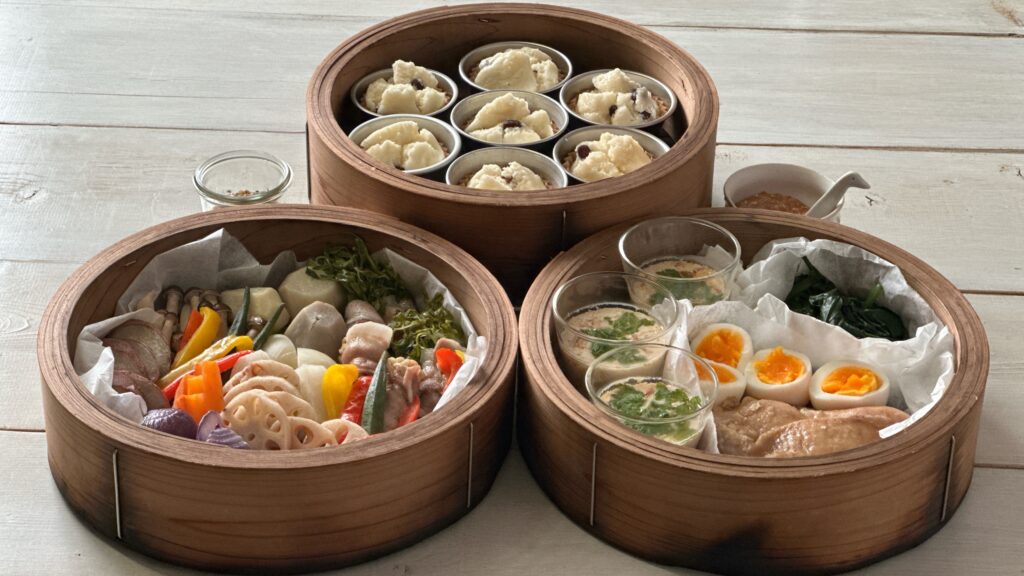 1段目:野菜のせいろ蒸し・豆苗とえのきの肉巻き